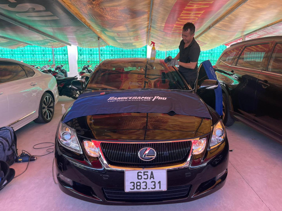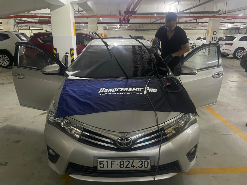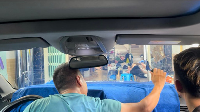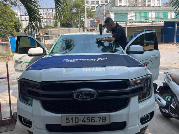 Dán phim lên kính vừa làm sạch, đây là bước quan trọng cần tỉ mỉ để tấm phim vừa khít kính xe.